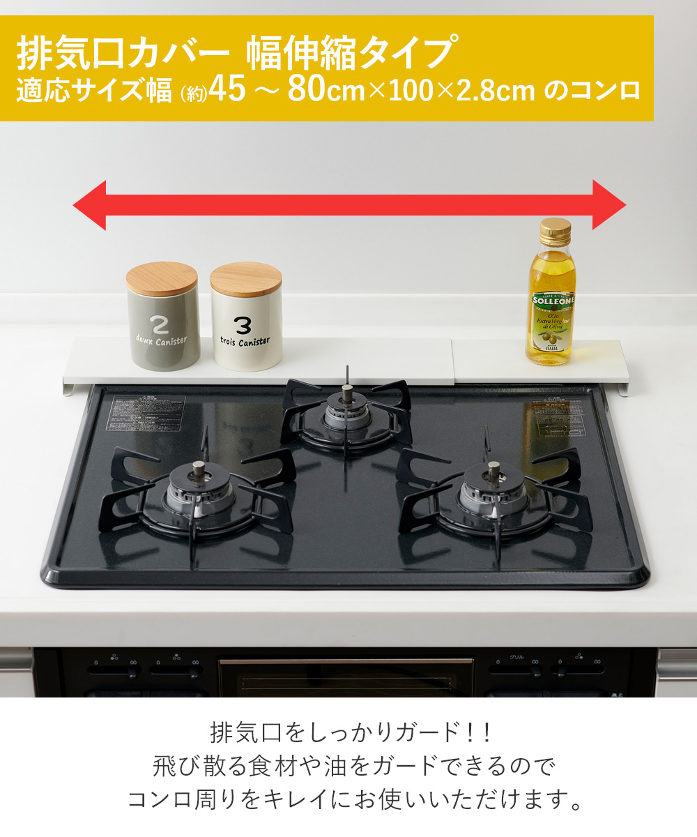 排気口の上に置くだけで油飛びや調味料汚れをしっかりガード!排気口に合わせて幅方向に伸縮可能です。