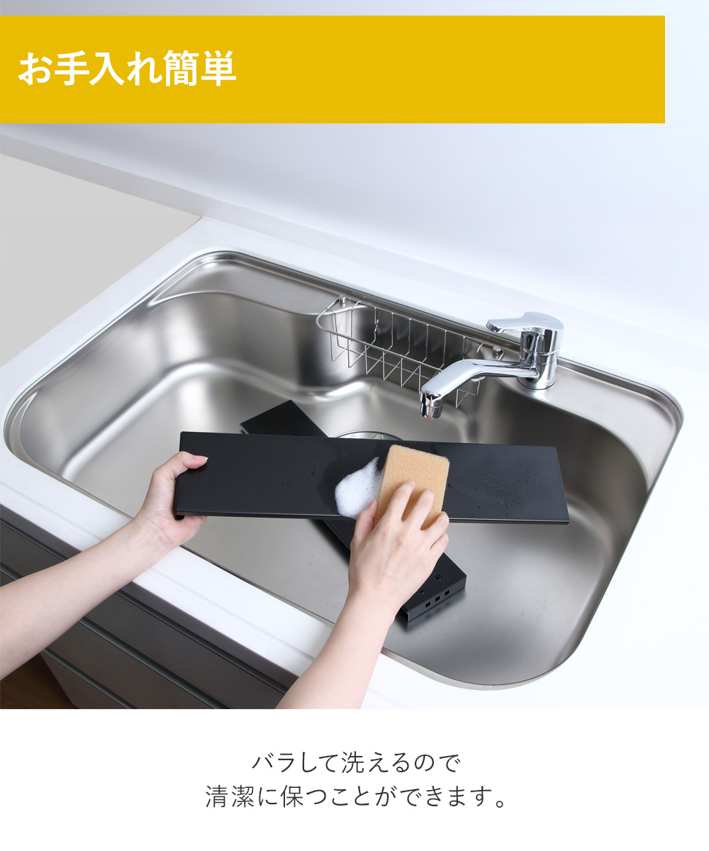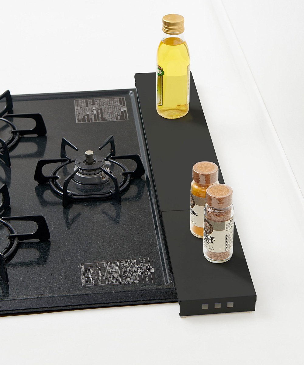 コンロのサイズに合わせて幅を伸縮させることができます。※幅伸縮可能サイズ:43~77cm(内寸)