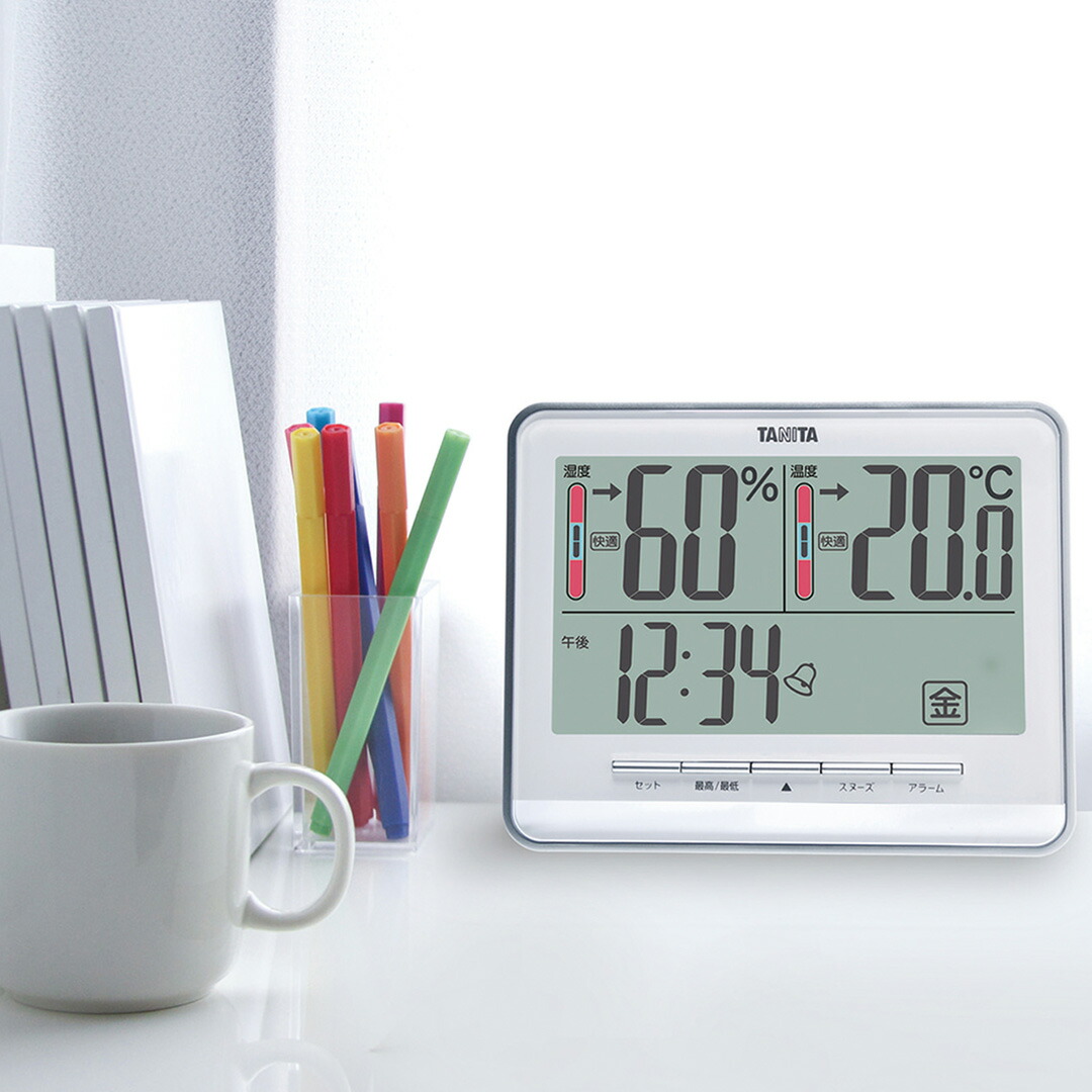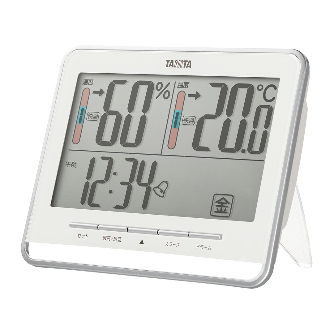 文字が大きくて見やすいデザインのデジタル温湿度計です。