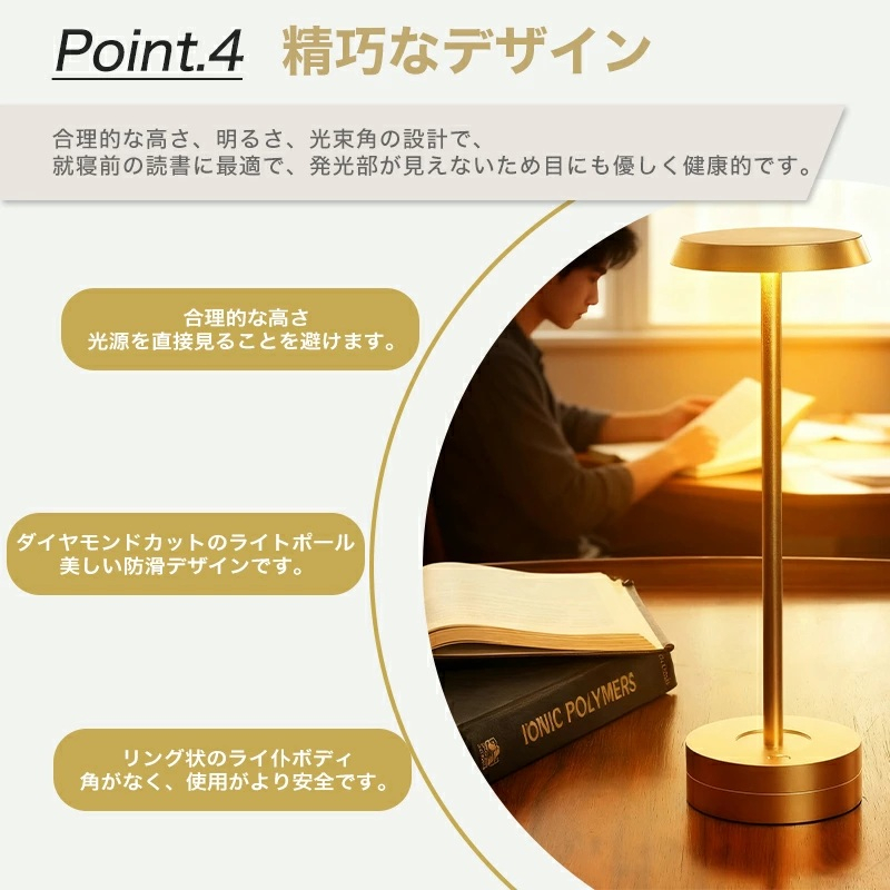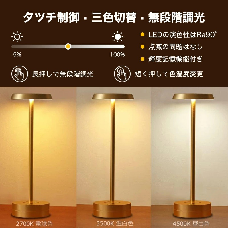 光は柔らかくて直接目に入らない。三つの色温度が調整でき、明るは5% から 100% まで無段階に調整可能となります。