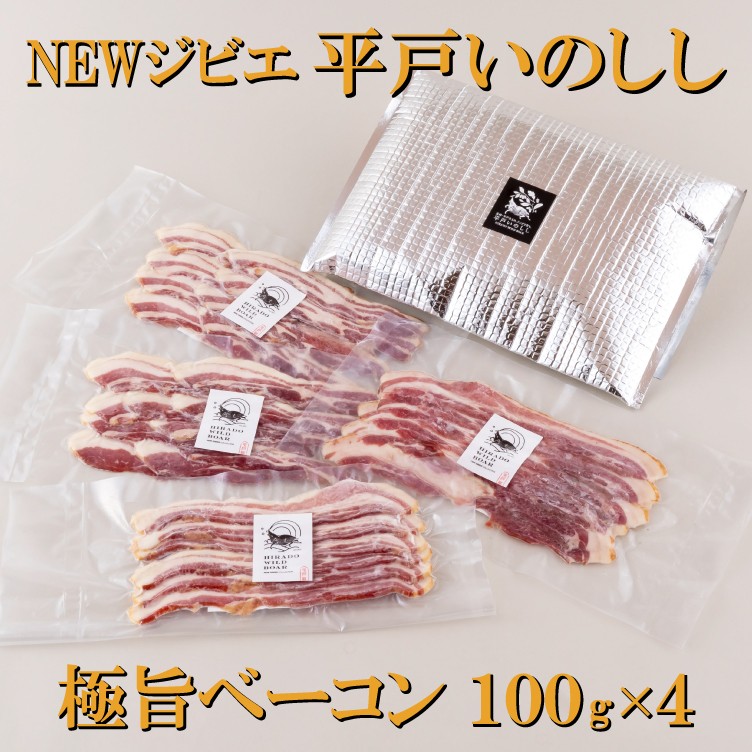 平戸いのしし 極旨ベーコン スライス 100g × 4セット野山を駆け巡りどんぐりを食べて育った猪は、栄養豊富でヘルシー!