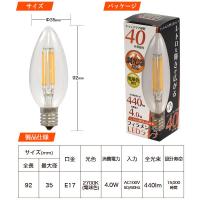 ■レトロな輝きが広がる!フィラメント型LED電球(シャンデリア球型) フィラメント型のLEDが輝き、幅広いシーンでレトロな雰囲気を演出します。シャンデリア照明器具やE17口金のペンダントライト、シーリングライトに最適です。 ■クリアガラスタイプ! 発光部が見えるクリアガラスタイプ。幅広いシーンを演出します。 ■シャンデリア球40W形相当!位相式調光器に対応!シャンデリア球40W形相当(全光束:440lm)で位相式調光器に対応しております。 お好みの明るさに調節してご使用いただけます。 ■電気代が1年間で 3468円もお得に! 同タイプ40W形シャンデリア電球から変更することで、電気代は1年間で約3468円もお得になります。 (1日10時間使用 1kw=26.4円にて計算) ■発熱量が少ない! 発熱量が少ないので、光の下にいても暑くありません。 また、LEDの光は、赤外線や紫外線をほとんど含まず、紫外線による色あせなども抑えます。 ■白熱電球に比べて長寿命設計!白熱電球に比べて寿命15,000時間※と長寿命設計。1日10時間使用しても4年間交換不要で使用できるので、長時間使う部屋や、取り替えにくい所にオススメです。 ※製品の寿命を保証する時間ではありません。製品仕様口金E17全長(約)92mm最大径(約)35mm重量(約)14g消費電力4.0W入力AC100V 50/60Hz 色温度2700K(電球色)全光束440lm注意事項・非常用照明器具・誘導等器具・水銀灯・ナトリウムラ ンプ・メタルハライドランプなどのHIDランプ器具などでは絶対に使用しないでください・密閉形器具や密閉に近い器具では使用しないでください。・紙や布などで覆ったり燃えやすいものに近づけないでください。 ・取り付け・取り外しの際には必ず電源を切ってください。 ・直流電源では絶対に使用しないでください。 ・高温多湿の場所ではご使用にならないでください。 ・器具で指定されているワット数以下のランプをご使用ください。 ・ぶつけたり、落としたりしないでください。 ・点灯中・点灯直後は高温になる場合があるため、直接手でふれないでください。 ・取り付けの際にはソケットに確実にとりつけてください。・水洗いや分解・改造はしないでください。 ・人感スイッチ等の自動点滅装置・遅れ停止スイッチなどには使用できない場合があります。・ラジオ、テレビや赤外線リモコン方式の機器から離してご使用ください。 ・同じ型名商品でも個体差があるため、照度や色温度の違いがあります。ご了承くださいませ。 ・LED電球周囲温度が-20〜40℃の範囲で使用してください。 ・ご使用の環境が省電力、調光器等により電圧が100V未満になる場合、電圧不足で点灯しない、又は点滅する場合がございます。・ホタルスイッチなど微弱な電流が流れる回路の場合、完全に消灯せずに薄っすら点灯する場合があります。・画像の光の色調はご使用のモニターの機種や設定により実際の商品と異なる場合があります。 ・画像は点灯イメージです。調光について ・1000Wを超える調光器とは組み合わせできません。・人感センサー付き・段調光型調光器・リモコン式調光器・記憶式調光器などと組み合わせて使うと使用できない場合があります。・ランプ単体では調光できません。調光には調光器が必要です。・調光時にチラつくことがあります。・調光の下限付近ではチラつきが発生しやすくなるため、常夜灯としては使用しないでください。・電源の変動によって、チラつきや立ち消えが発生することがあります。ドライヤー・掃除機、電子レンジ、温水便座などを使用すると電源の変動が起こり、チラつきや立ち消えが発生することがあります。・調光器の種類によってはチラつくことがあります。・複数の調光器を使用する場合、チラつくことがあります。・調光時に調光器・ランプからわずかに音がすることがあります。・調光した時の明るさや電力の変化は電球と異なります。・調光器のつまみを絞って消灯させても電力は消費します。長時間消灯する場合は、電源スイッチを切ることをお勧めします。・複数のランプを接続して調光した場合、下限付近で調光できないことや、個々の明るさや消灯にばらつきが発生することがあります。・0%に近い明るさで電源を切り、電源を再投入した場合は点灯までに時間がかかったり、点灯しない場合があります。この場合一度100%の明るさにすると点灯します。