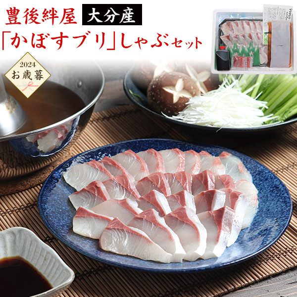 2024年 お歳暮 冬ギフト大分 豊後絆屋 大分産「かぼすブリ」しゃぶセット大分県が日本一の生産量を誇る“かぼす”(全国9割)を食べて育った“かぼすブリ”。かぼすと同じく、大分ではブリ養殖の生産量も盛んで全国第3位を誇ります。主に臼杵市や津久見市、佐伯市など、豊後水道の恵まれた環境で育てられたブリは、身が締まって脂ののりが良いと評判で、“豊(とよ)の活ぶり”として大分ブランドに位置づけられています。そんな中で新しく2010年から、ブリに脂がのり、美味しさのピークを迎える冬限定で生産に取り組み始めたのが、“かぼすブリ”です。熨斗対応(短冊熨斗)承ります。製品仕様商品名大分 「豊後絆屋」 大分産「かぼすブリ」しゃぶセット内容量(約)かぼすブリ切身350g、かぼすポン酢70mlもみじおろし5g×4、和風スープ250g×1賞味期限出荷日より30日アレルギー表示小麦一括表示【魚】ぶり(大分県) (養殖) 【スープ】 蛋白加水分解物(国内製造)、 米発酵調味料、還元水飴、醤油、昆 布エキス、ミリン、食塩、 鯛エキス、 鰹エキス、ホタテ エキス、 魚介パウダー、鰯エキス/ソルビトール、 pH調整剤、調味料(アミノ酸等)、増粘 剤(キサンタン)(一部に小麦・大豆を含 む) 【ポン酢】 醤油(国内製造)、醸 造酢、かぼす果汁、煮干しエキス、砂糖 果糖ぶどう糖液糖、 魚醤/カラメル色 素、調味料(アミノ酸等)、 アルコール、ビタミン B1、(一部に小麦・大豆を含む) 【モ ミジオロシ】 大根(中国産)、唐辛子/酒 精、酸味料、ベニコウジ色素