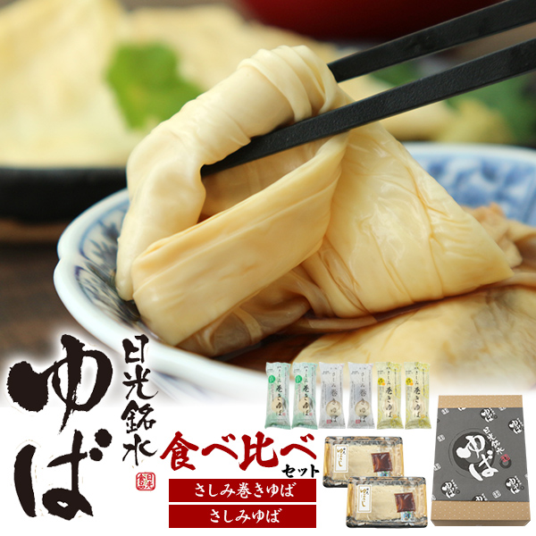 ゆば食べ比べセット(さしみゆば2パック+さしみ巻ゆば3種各2袋)「ゆば」処で有名な日光で、日光銘水・国産大豆を使用したギフトセットです。 日光の「ゆば」は江戸時代から続く伝統食と知られ、修行僧や精進料理との文化とも深く結びつきがあり精神性と食文化が融合した食品です。 手作り刺身「ゆば」1枚入り×2パックと、さしみ巻き3種×各2袋のギフトセットとなっています。こだわり抜いた国産素材と水を使用し、伝統の手作り製法を用いた「ゆば」はまさに絶品。 「手作り刺身ゆば」は食べ応え抜群、「さしみ巻きゆば」はゆず・しそ・醤油(ノーマル)の3種のたれで食べ比べ可能です。 なめらかで繊細な舌触りで、和食素材として使いやすく日光お土産としても親しまれています 。食感も柔らかく食べやすいことから年齢を問わず愛される食品となっています。 製品仕様内容量(約)●さしみ巻き「ゆば」×6 ゆず・しそ・醤油(ノーマル)各2個 ●さしみ「ゆば」×2