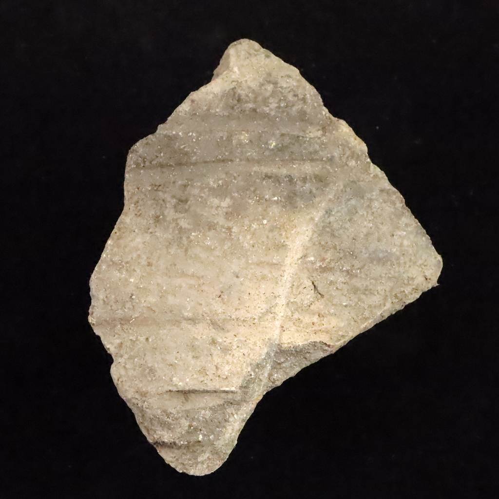 ◆ 本品は、東北・北海道地域にて出土したと伝わる縄文時代中期頃(紀元前4000年から紀元前3000年)に作られたと考えられる土器の一部です。本品は縄文時代の土器片で、外面には斜め方向へ繰り返し刻まれた細い条線文が確認できるのが特徴です。指先で引いたような浅い溝が一定のリズムで並び、当時の成形工程や装飾意図を伝えてくれます。条線の間には砂粒を含む胎土がきらりと光り、焼成による自然な色むらも味わい深い表情を見せています。破断面には粗い粒子が多く、縄文土器らしい力強い土質が残されています。内面はなだらかに均され、使用痕と思われる摩耗がうっすらと見られます。なお、裏面の一部には、前コレクターが展示固定のために用いた接着材の跡が残っております。出土地は未詳ですが、装飾痕の残り方から実用器の一部であったことがうかがえる資料的価値の高い一点です。