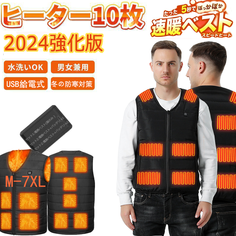 電熱ベスト 2024強化版 発熱ベスト 日本製ヒーター ベスト バッテリー付き 10エリア発熱Vネック中綿入り ヒーターベスト ヒートベスト 電熱ウェア防寒着 バイク