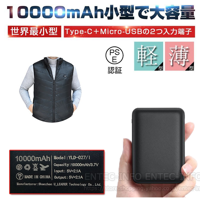 即納 専用モバイルバッテリー 大容量 軽量 10000mAh 急速充電 電熱ベスト対応 iphone PSE認証済み 小型 二台同時充電 残量表示 防寒ベスト 作業服 送料無料