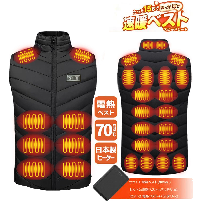 【40000mAhバッテリー】電熱ベスト バッテリー 加熱ベスト 28枚内蔵 日本製 繊維ヒーター ヒーターベスト USB DC給電 速暖 暖房ベスト 男女兼用 軽量 敬老の日