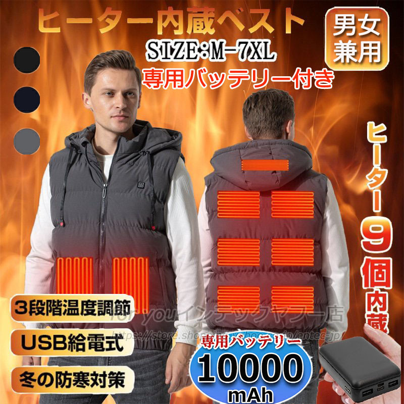 2025電熱ベスト バッテリー付き/選択可 電熱 ベスト 日本製ヒーター ベスト 9エリア発熱 ヒーターベスト 暖房服 中綿 大きいサイズ フード付き メンズレディース