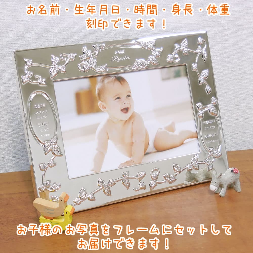 お名前・誕生日時・身長・体重が刻印できるベビーフレームです。フレームにはアラベスク模様を思わせる葉っぱやツル。少し落ち着いた印象です。
