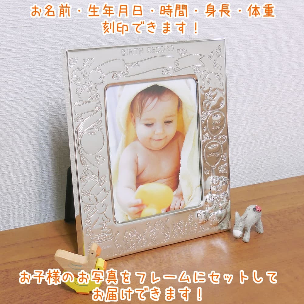 お名前・誕生日時・身長・体重が刻印できるベビーフォトフレームです。フレームにはたくさんの動物が描かれていて、可愛らしさにあふれています!