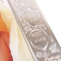 表面は鏡面仕上げでピカピカ、刻印が映えます。写真は最大で約12.5cm×15cmのものが入ります。窓部分の大きさは約7.5cm×10cmです。フレーム上部分にお名前、左側の円に出生時間、右側の風船上側に誕生日、風船下側に体重、左下の角に身長を刻印します。裏面はスエード調の布張りです。出産祝いとして大変喜ばれるギフトです♪