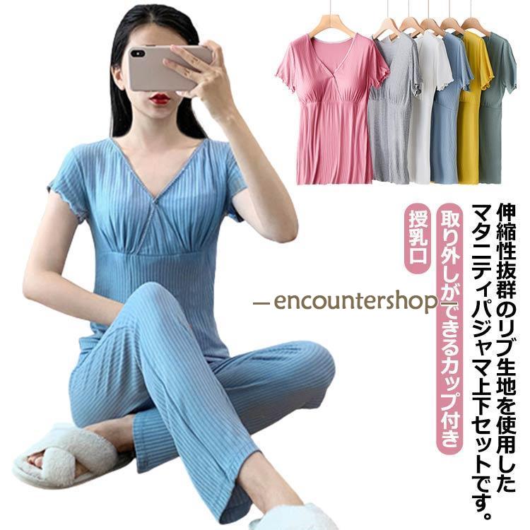マタニティ パジャマ リブ 半袖 授乳服 上下 セット 春夏 夏 マタニティー ルームウェア セットアップ ショートパンツ 短パン マタニティウェア