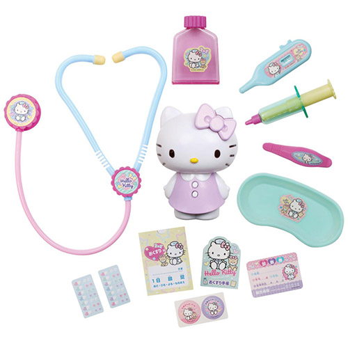 ハローキティといっしょにお医者さんごっこができるアイテムいっぱいのセットです。