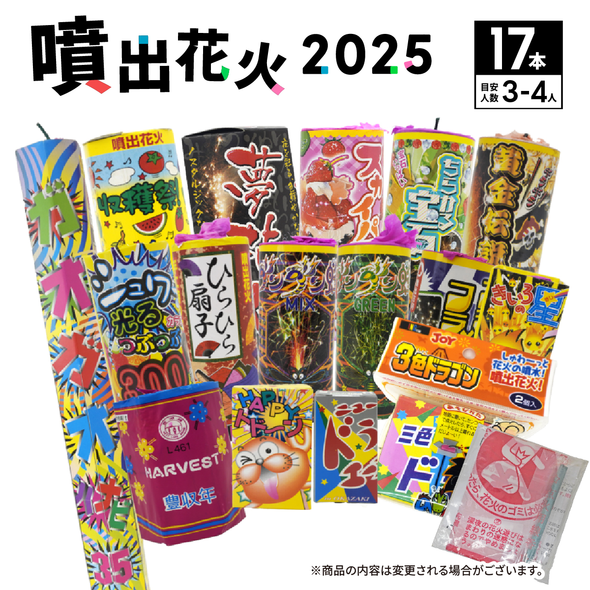 噴出花火17本の袋詰めセットです。弊社での詰め合わせのため、大量ご注文の場合には少々お時間をいただく場合がございます。