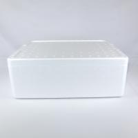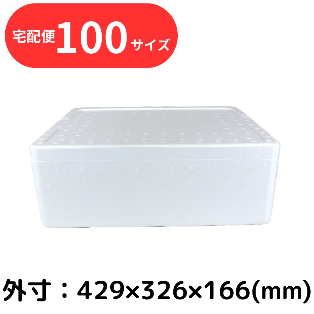 外寸:長さ429×幅326×高さ166(mm) 宅配:92サイズ 内寸:長さ387×幅286×高さ120(mm) 容量:13.3L 発泡倍率:50倍相当 白色の箱です。