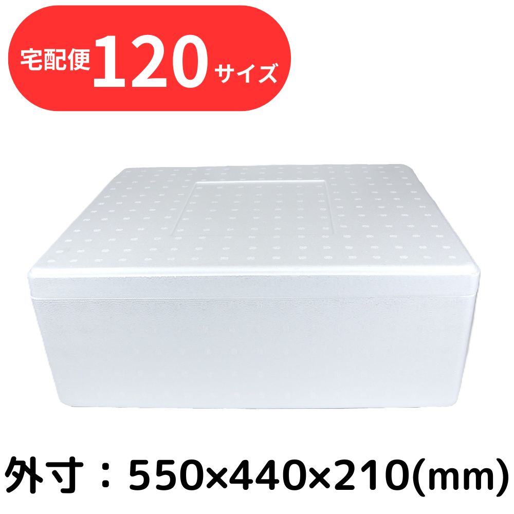 外寸:長さ550×幅440×高さ210(mm) 宅配:120サイズ 内寸:長さ500×幅390×高さ165(mm) 容量:32.2L 発泡倍率:50倍相当 白色の箱です。