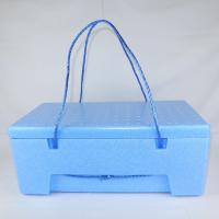 「MB-15B」発泡スチロール容器は、ひも付きの土産箱タイプです。色は青です。宅配(100サイズ)の大きさです。ひもを取り付けるための「耳」がなく、側面がフラットな形状です。