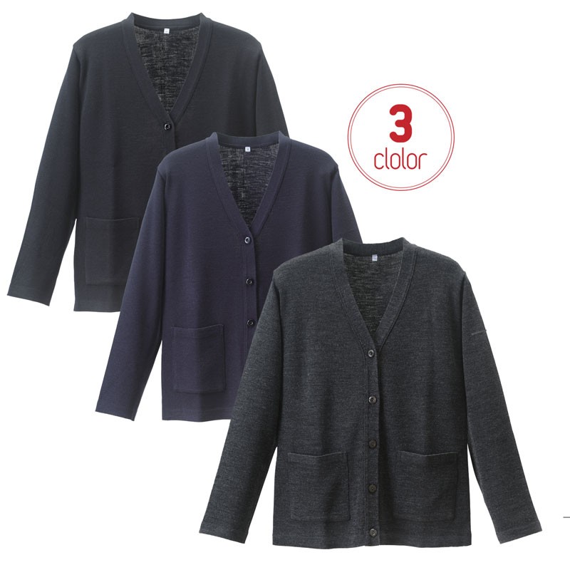 | 特徴 | 送料無料 長袖タイプ。ポケット付き。筒袖でオフィスでの着用にピッタリ。毛玉が出来にくい抗ピル加工。静電気の嫌なパチパチやまとわりつきを防止。家庭で洗濯機洗い(弱)可能。繊細な印象の14ゲージゴム編み。耐久性・速乾性にすぐれ色落ちも少ない業務用性能。カジュアル用の安いカーディガンとは品質が違います。安心の日本製です。もちろんカジュアルな着こなしにも重宝するニットです。大きいサイズのLLもございます。