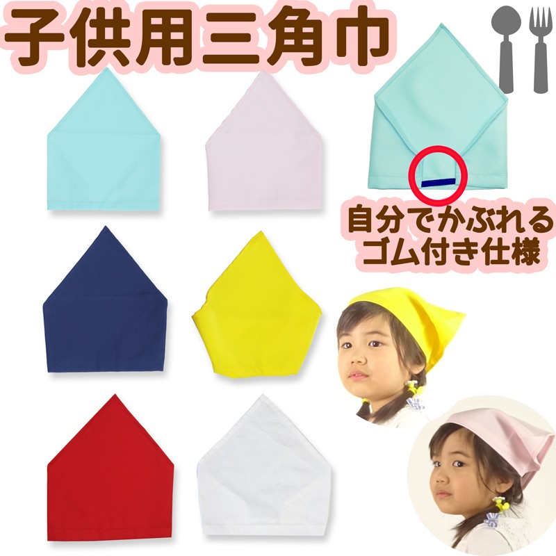 送料無料 ゴム付き 子供用 三角巾 キッズ用 幼児でも本当にひとりでかぶれる 白 黄 紺 赤 水色 ピンク 無地 家庭科 調理実習 三角布 幼稚園 保育園 小学 000-CK