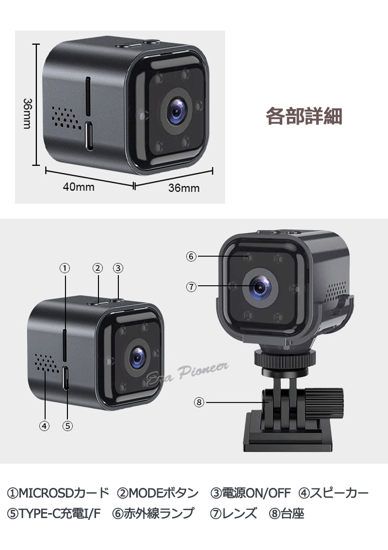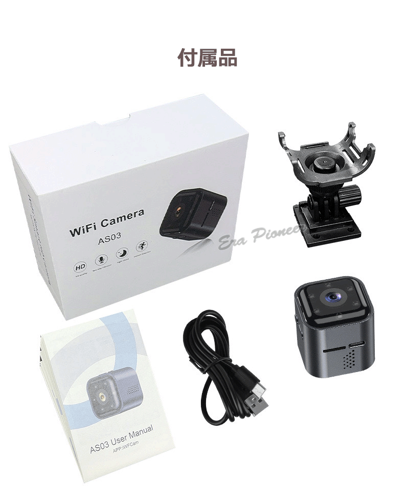包装箱、カメラ本体、充電ケーブル、台座(3Mテープ)、日本語説明書ダウンロード可能