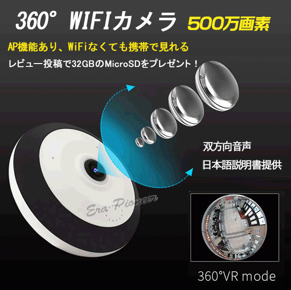 機能:Wifiネットカメラ/最大500万画素/360度視野/AP機能あり/双方向音声/128GB対応/動体検知/赤外線/V380アプリ