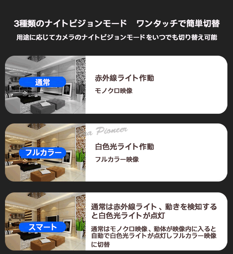 3種類のナイトビジョンモード ワンタッチで簡単切替