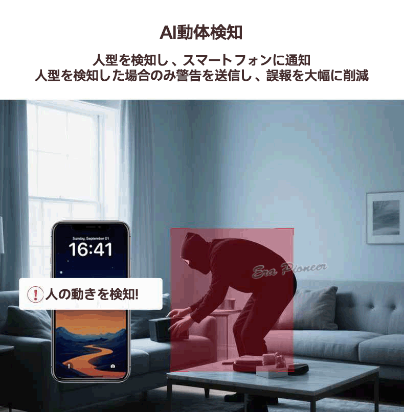 人型を検知したら、スマートフォンに通知可能、人型を検知した場合のみ警告を送信し、誤報を大幅に削減