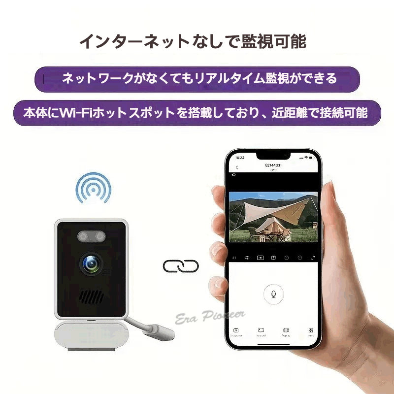 インターネットなしで監視可能(本体にWi-Fiホットスポットを搭載しており、近距離で接続可能)