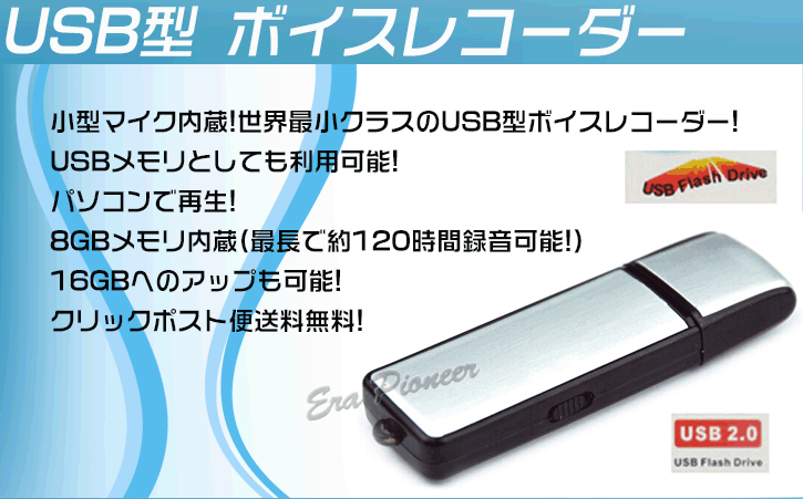 ボイスレコーダー USB型 8GB内蔵 USBメモリ 大容量 長時間録音 携帯便利 操作簡単 16GBへアップ可能 ICレコーダー vr01