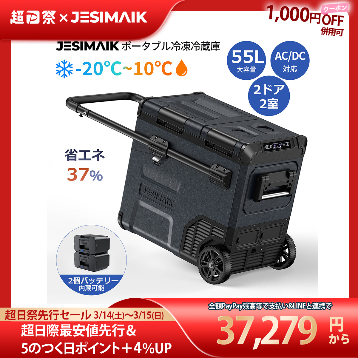 ポータブル冷蔵庫 JESIMAIK E55 55L 車載冷蔵庫 省エネ37% 2ドア 2室個別温度設定 大容量 急速冷凍 車中泊 防災グッズ 爆買