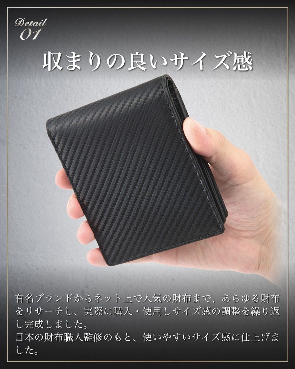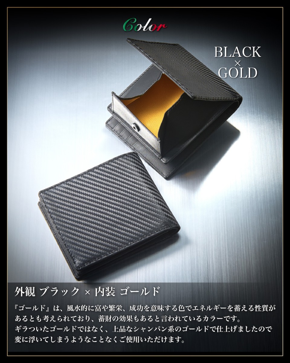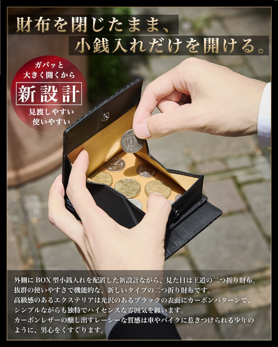 | ◆ イタリアン カーボンレザー 二つ折り財布 BOX型小銭入れ | 世界中の多くの方に愛されている 革の本場イタリアで生まれた「 イタリアンレザー 」をベースに「 カーボン 加工 」を施した カーボンレザー で製作した 外側 ボックス型小銭入れ の メンズ財布 です。 独特のラグジュアリー感と光沢のある レザー は 財布 の品格をグッと引き上げます。 またカーボンレザーは、傷や汚れがつきにくく、撥水性も高い丈夫な素材。初めて 革製品 を持つ場合は、使いやすく手入れのしやすい素材です。 |