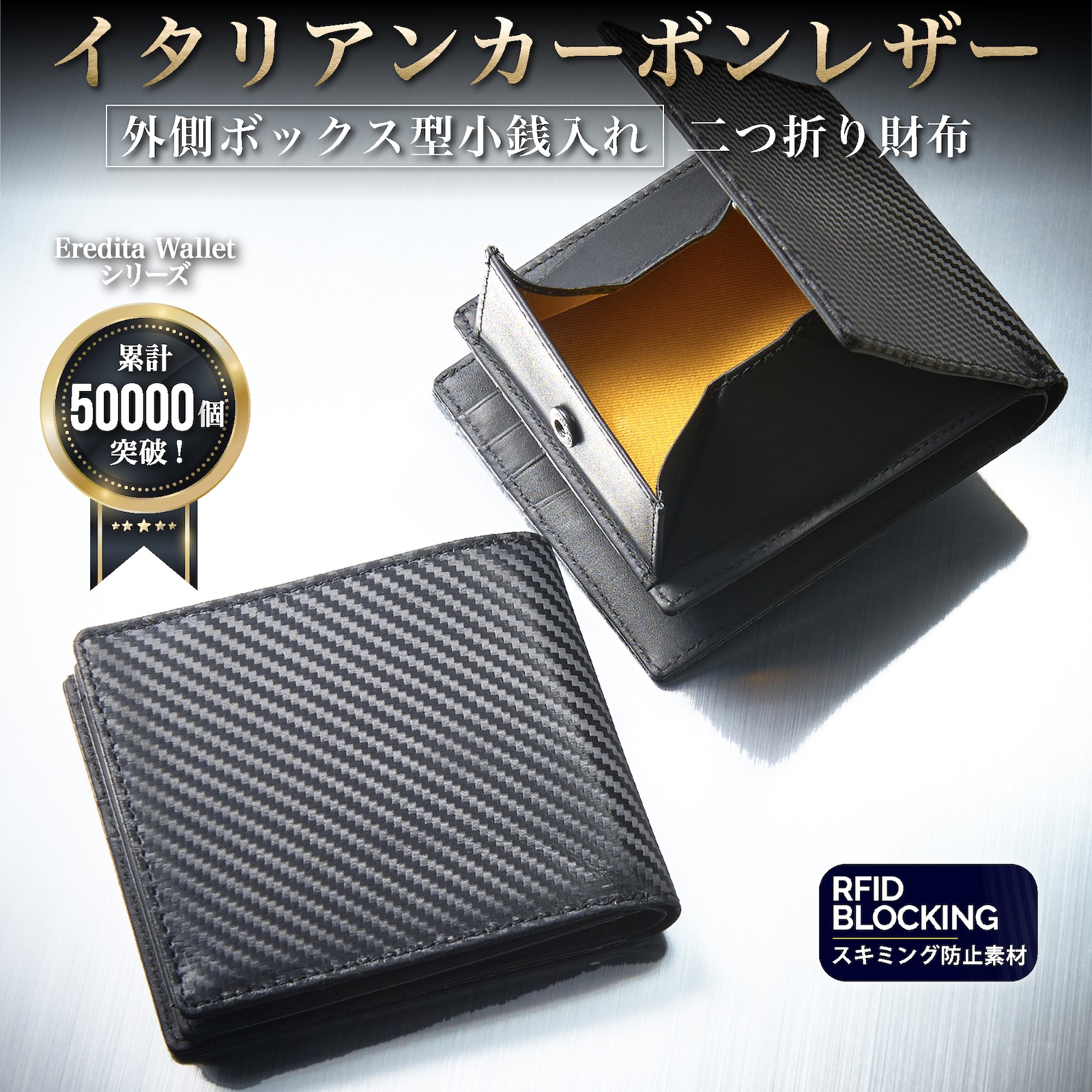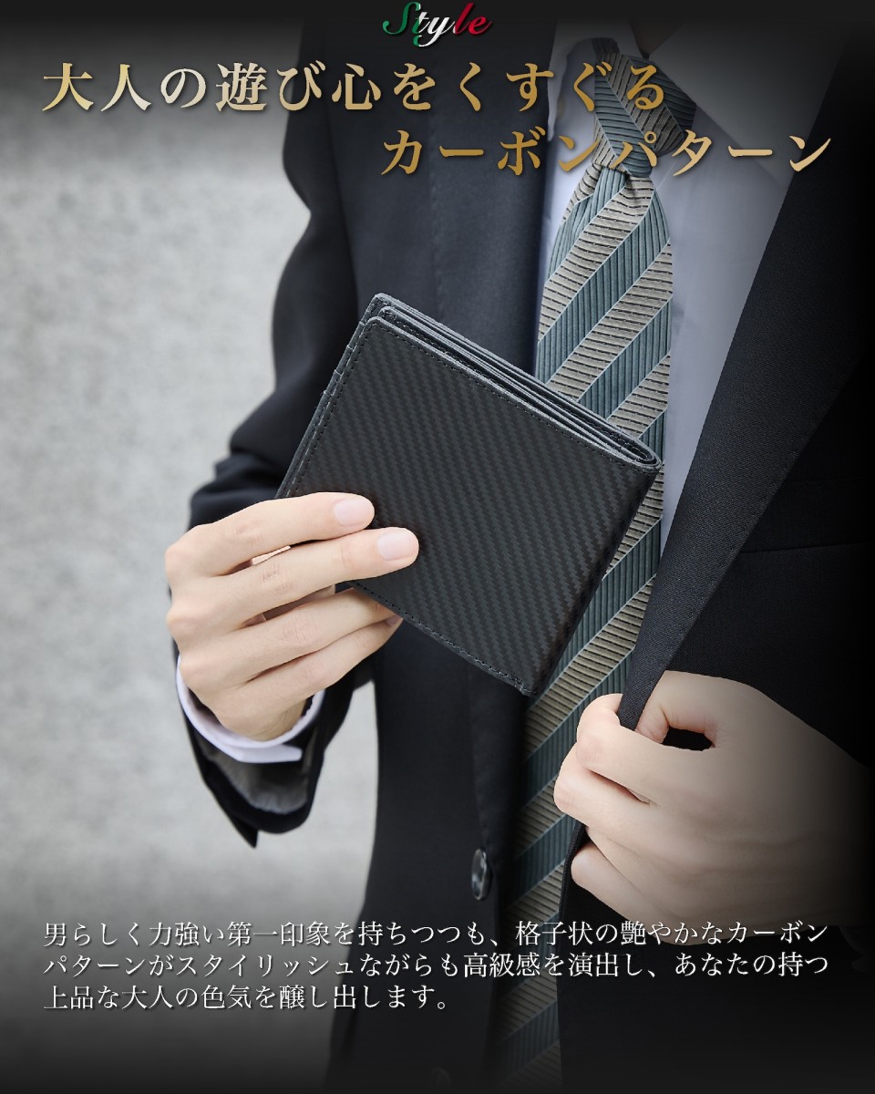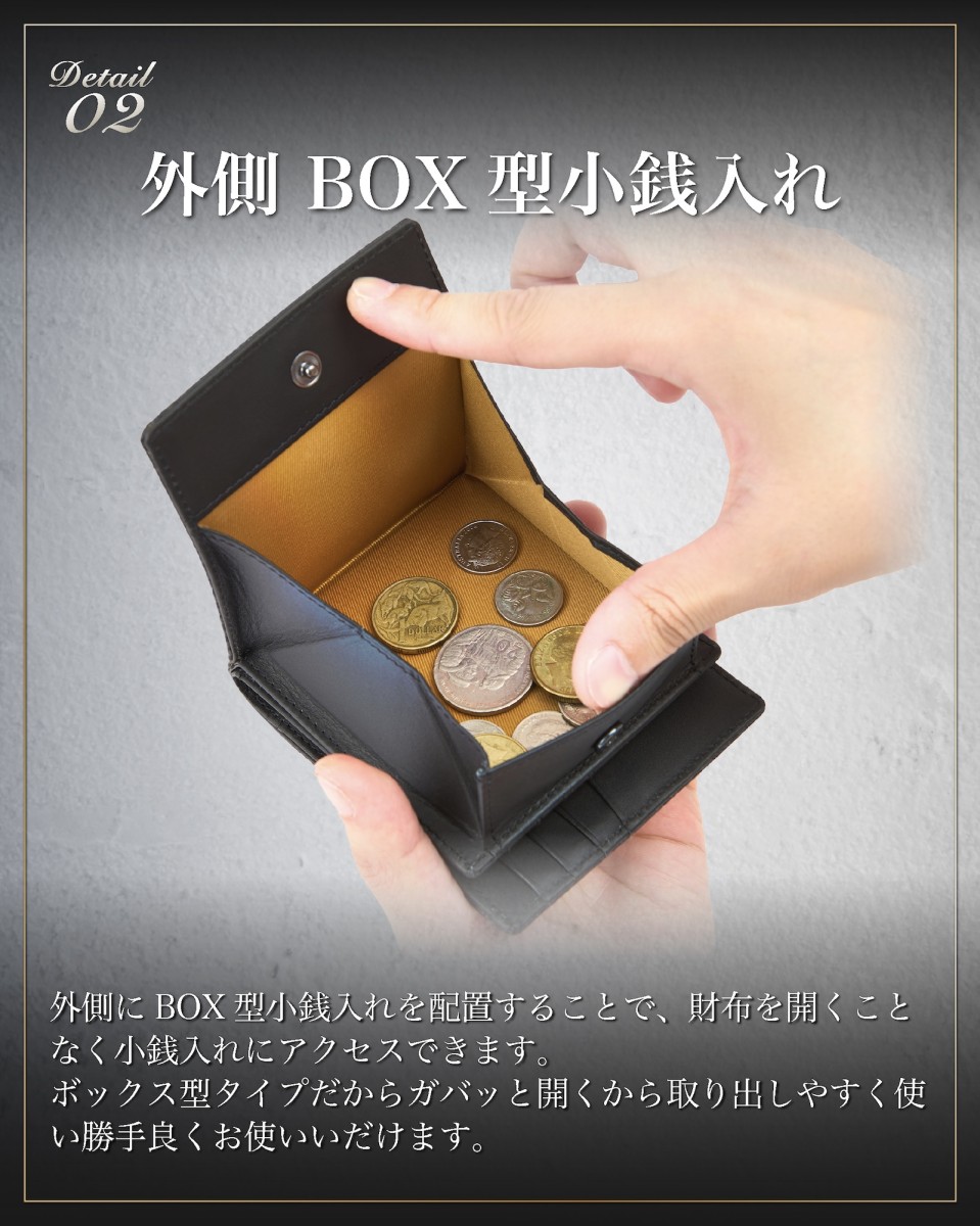 | ◆ イタリアン カーボンレザー 二つ折り財布 BOX型小銭入れ | 世界中の多くの方に愛されている 革の本場イタリアで生まれた「 イタリアンレザー 」をベースに「 カーボン 加工 」を施した カーボンレザー で製作した 外側 ボックス型小銭入れ の メンズ財布 です。 独特のラグジュアリー感と光沢のある レザー は 財布 の品格をグッと引き上げます。 またカーボンレザーは、傷や汚れがつきにくく、撥水性も高い丈夫な素材。初めて 革製品 を持つ場合は、使いやすく手入れのしやすい素材です。 |