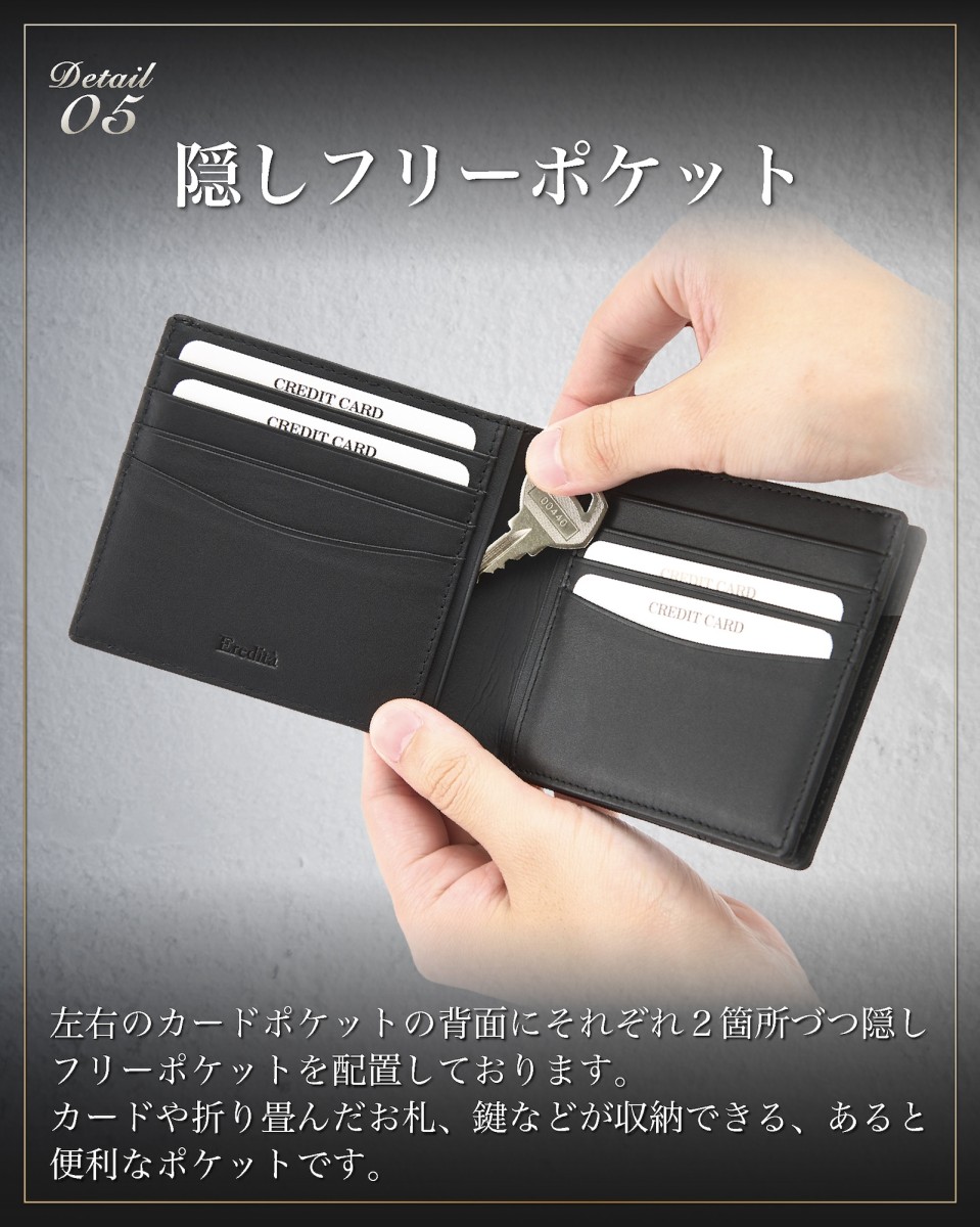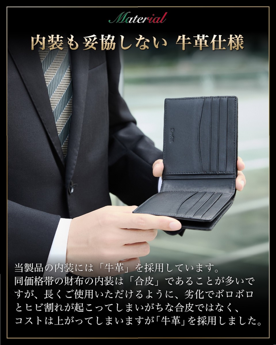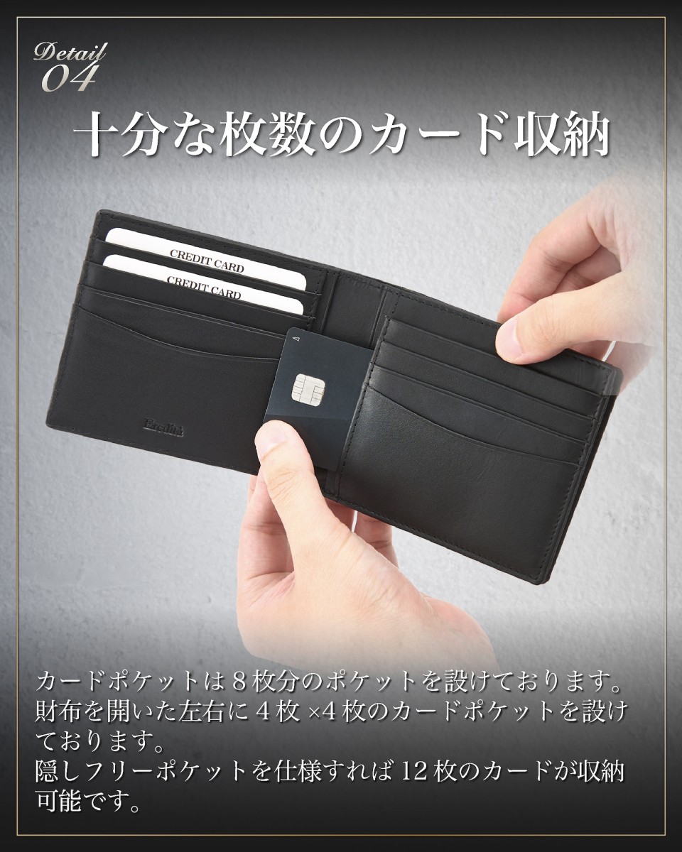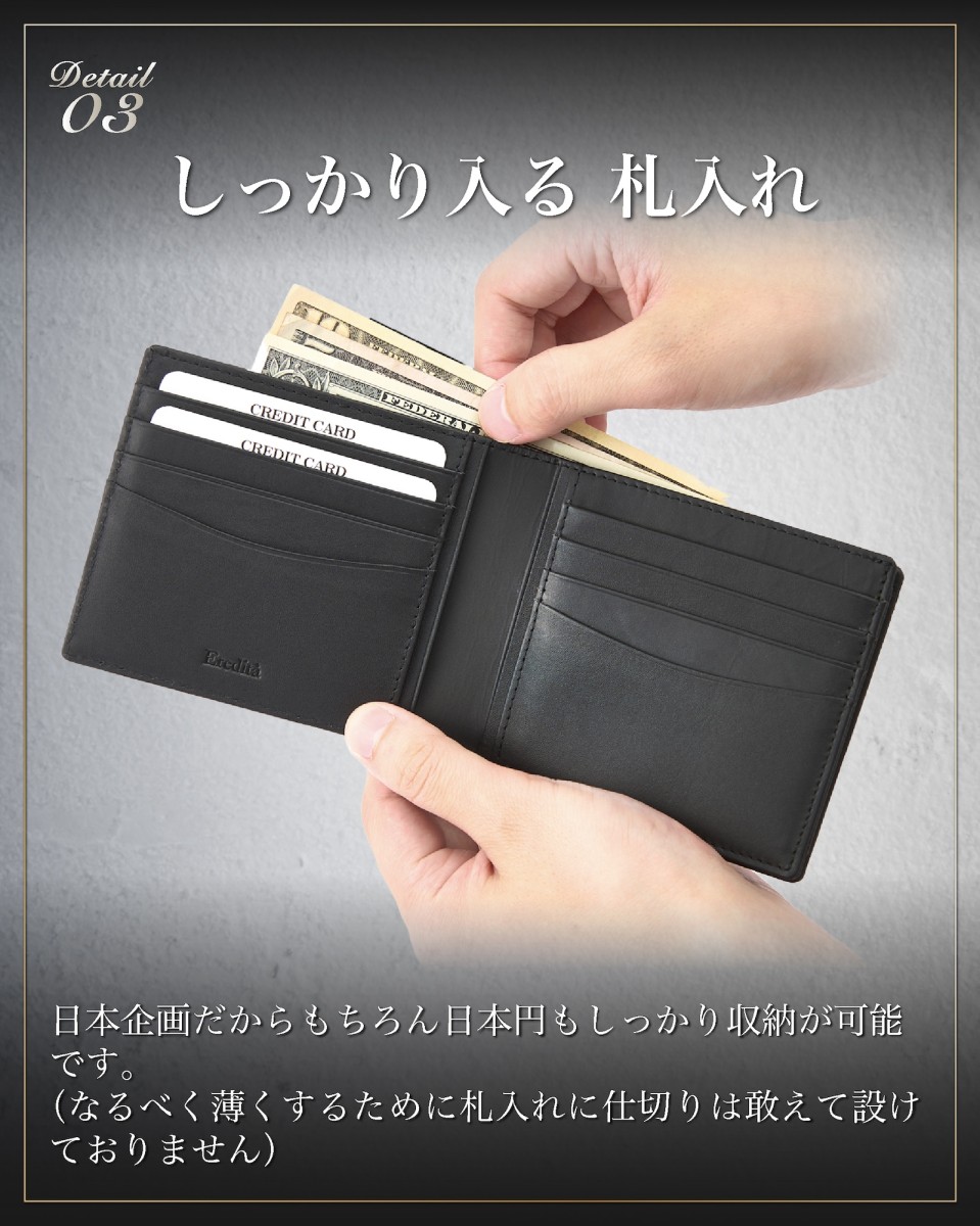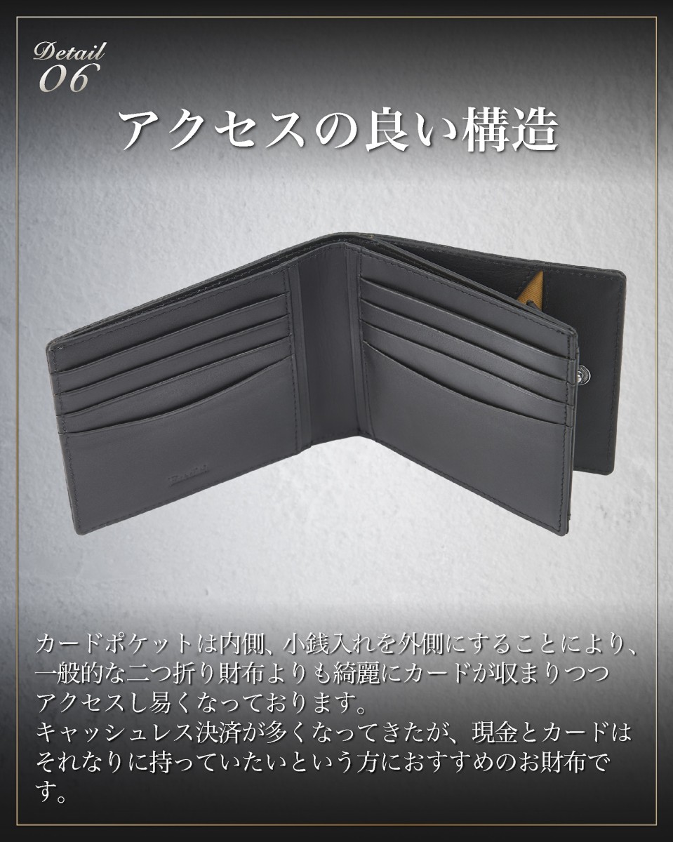 | ◆ 収まりの良い ちょうどいいサイズ感 | キャッシュレスな時代背景も考慮し、薄さ、コンパクトさ収納力を考えテストを繰り返し製作しました。 二つ折り にした際に 財布 の厚みで胸やお尻のポケットの膨らみを最小限に抑えスマートにお使い頂ける メンズ 財布 です。 |