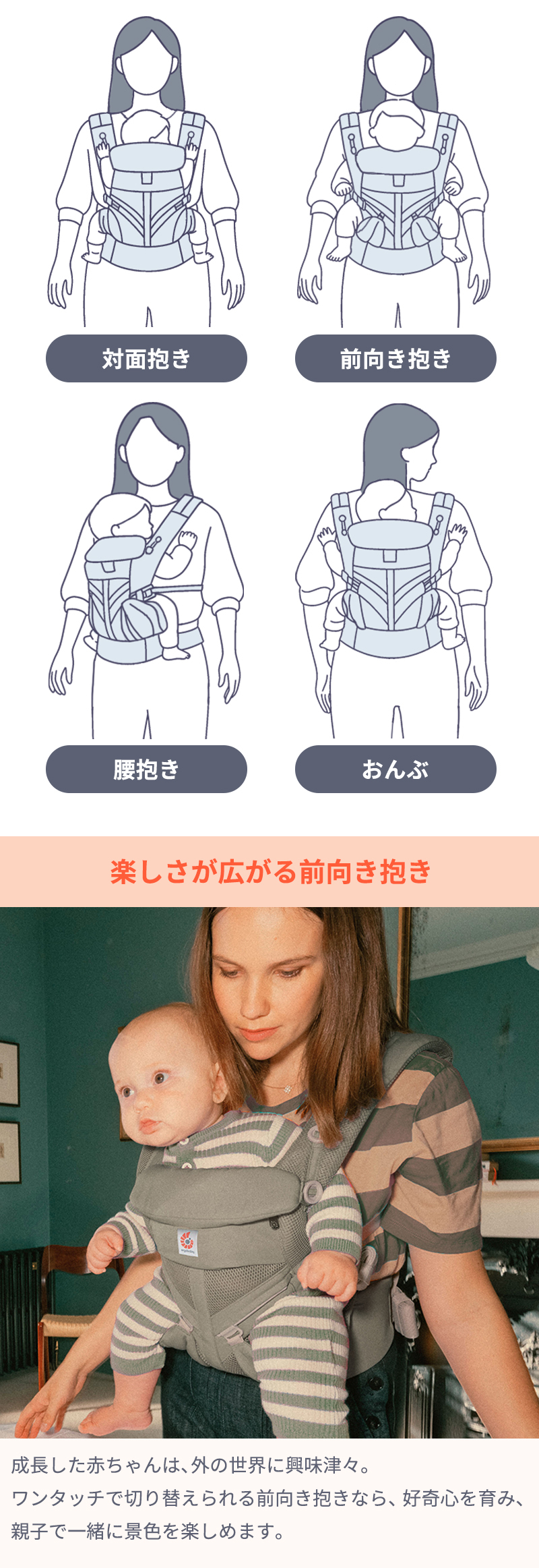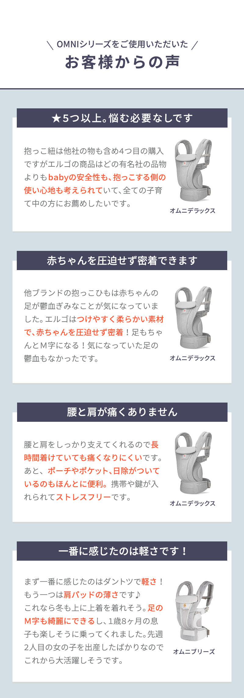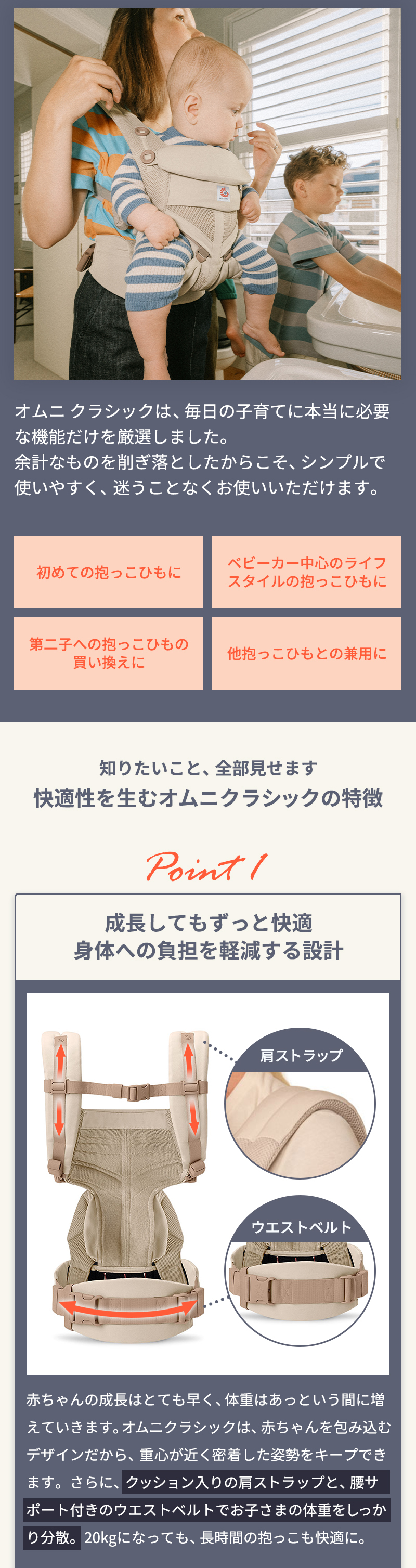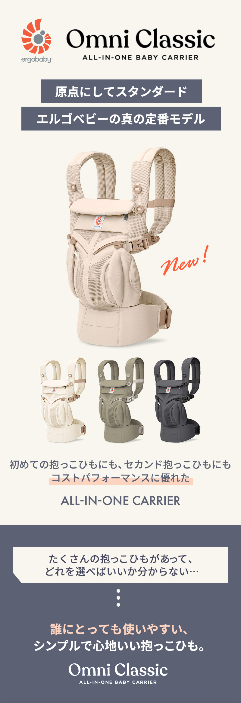 快適な毎日を、手にしやすい価格で。コストパフォーマンスに優れたスタンダードモデル OMNI Classic (オムニクラシック) 新生児からすぐに使えて、4通りの抱っこをサポート。 初めての抱っこひもにも、買い足しの抱っこひもにも、どのタイミングにも、どんな方にも使いやすい、 コストパフォーマンスに優れたAll-in-oneベビーキャリアです。 |