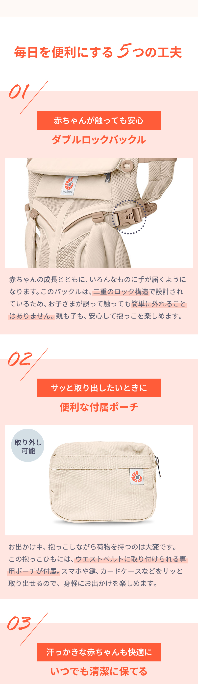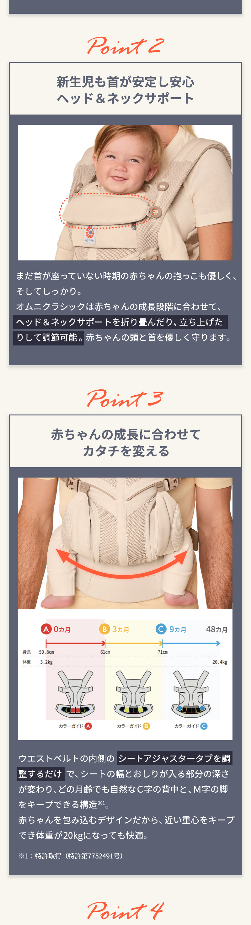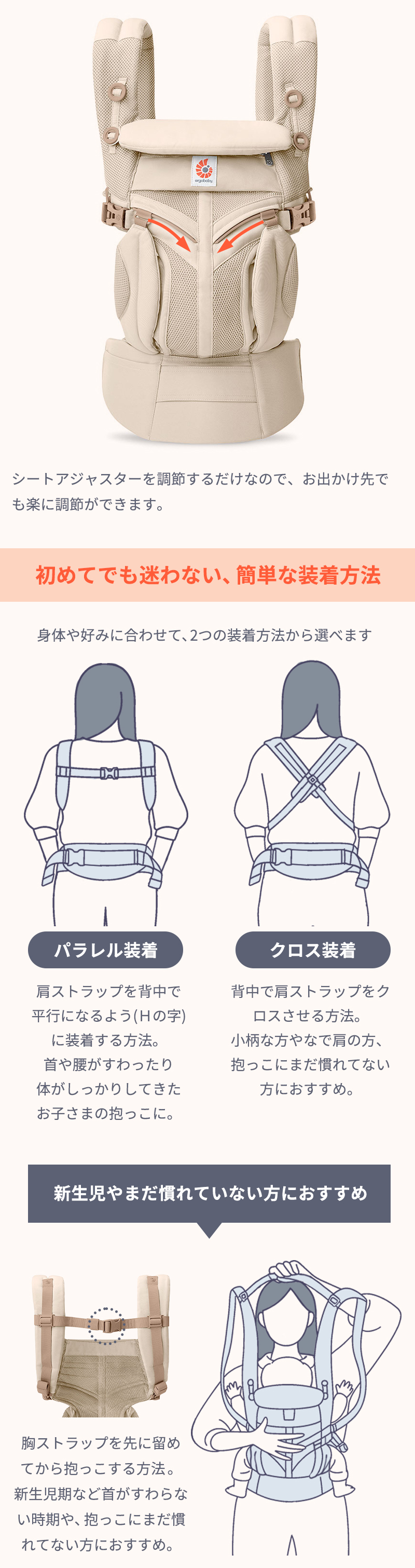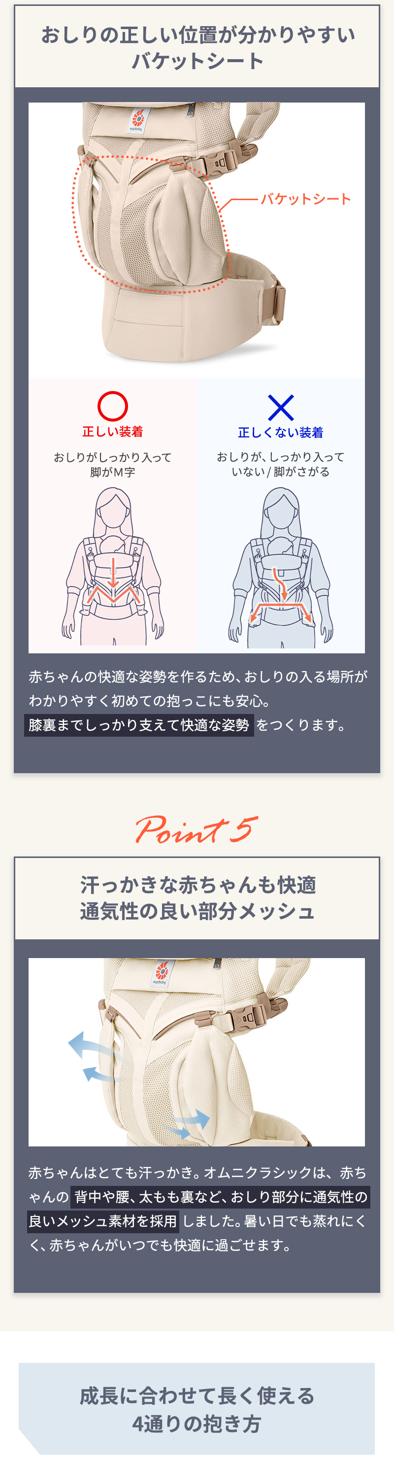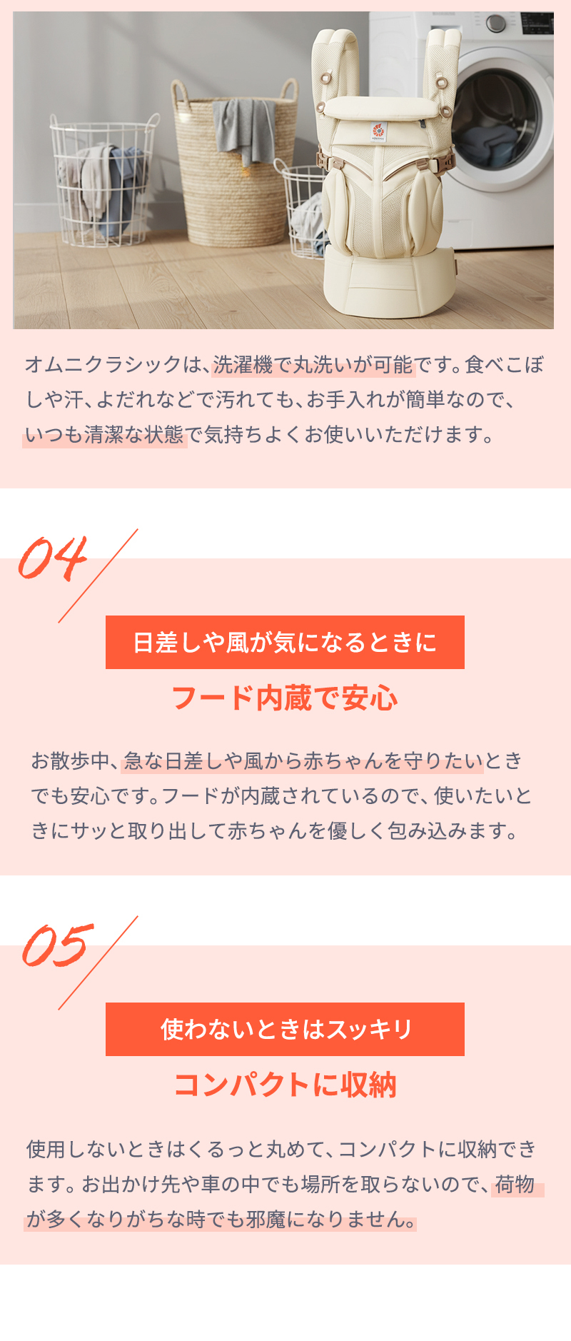 快適な毎日を、手にしやすい価格で。コストパフォーマンスに優れたスタンダードモデル OMNI Classic (オムニクラシック) 新生児からすぐに使えて、4通りの抱っこをサポート。 初めての抱っこひもにも、買い足しの抱っこひもにも、どのタイミングにも、どんな方にも使いやすい、 コストパフォーマンスに優れたAll-in-oneベビーキャリアです。 |