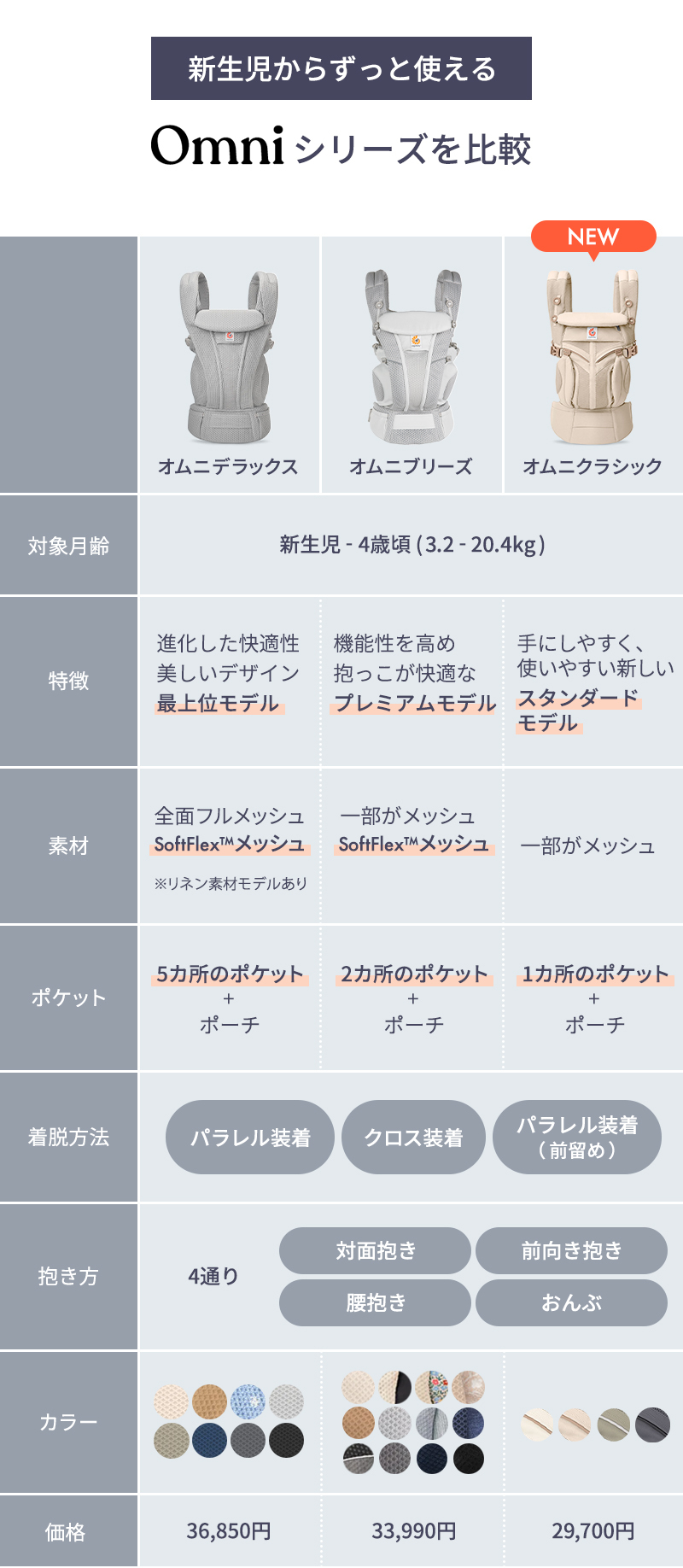 | 進化を続けて長年愛されるエルゴベビーの最新モデル、OMNI Breeze (オムニ ブリーズ) ・新生児から幼児(3.2kg〜20kg)までの成長に合わせて調節ができ、前向き抱き・対面抱き、おんぶ、腰抱きの4通りの抱き方が可能。 ・柔らかい肌ざわりと優れた通気性を持つSoft Flexメッシュを、ムレが気になるお子さまの背中からお尻部分にかけて使用しているので、 抱っこひもの中の湿気や空気を素早く外に逃がします。 ・人間工学に基づいた設計で肩腰に負担をバランスよく分散。 体にフィットしやすいスリムな設計で、素手のだっこに近い、密着した抱っこができます。 ・反射板やサイドポケット、日よけ風よけのフードなど新しい便利機能が追加され、機能もさらに充実しました。 ・シートアジャスタースライダー:抱き方に合わせてシートを調整します。前向き抱きの場合はスライダーを内側へスライド、どの抱き方でも快適に抱っこできます。 ・シートアジャスタータブ:抱っこひものウエストベルトの裏側にある着脱テープでサイズ調節ができます。月齢や身長を目安にカラーガイドで3段階に調節が可能です。 |
