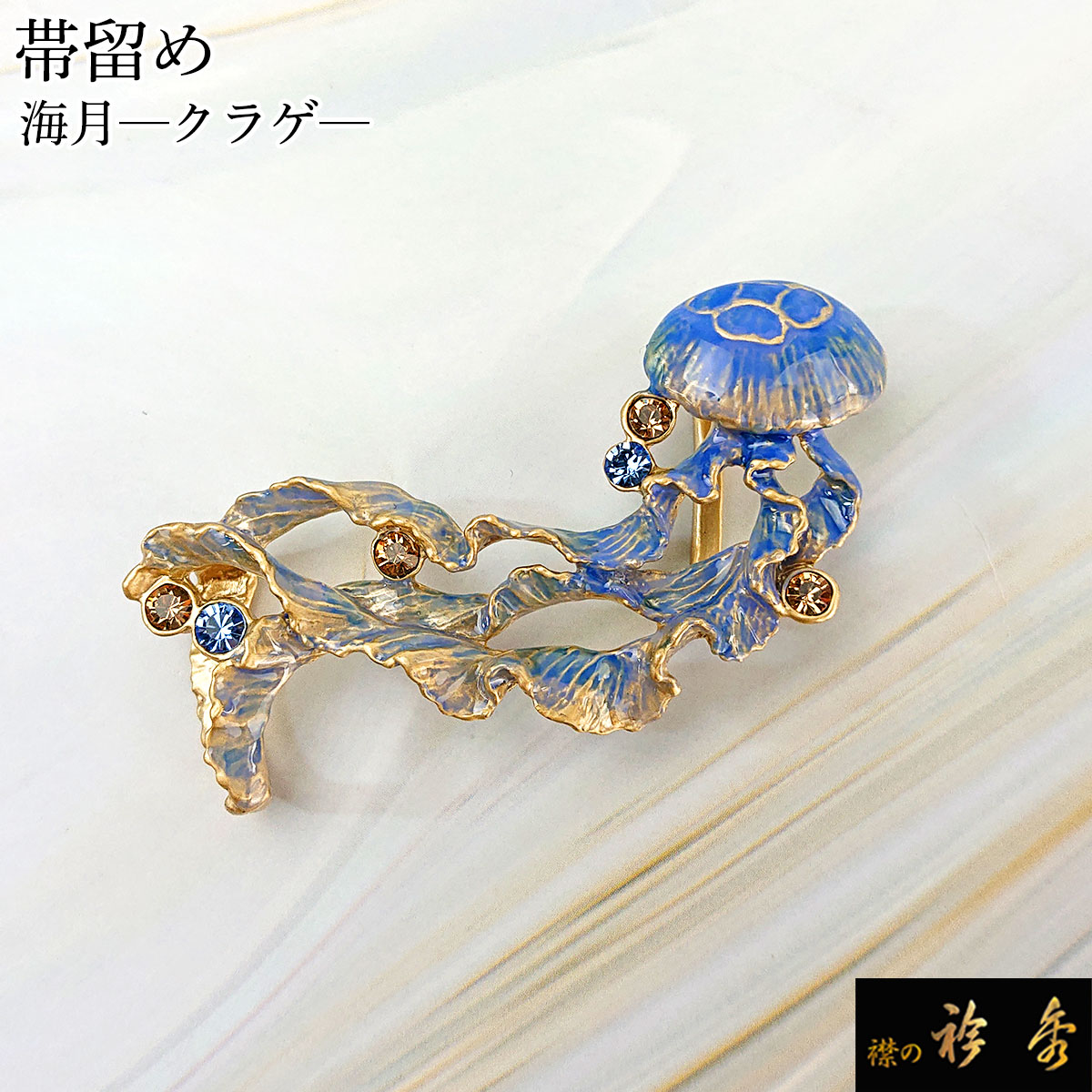 ひらひらとしたフリルのような触手の造形が美しく、海に揺られた動きのある様子が魅力的なアイテムです。帯締めの支え部分も触手の一部としてデザインされました。夏の浴衣に合わせやすい色味に、光が当たるとキラキラ輝くカットガラスが散りばめられ、透明感のある上品な雰囲気を演出します。