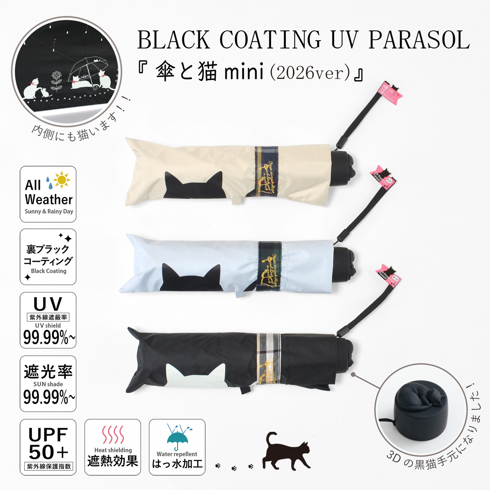 猫 傘 折りたたみ傘 日傘 黒コーティング 雨晴兼用 50cm 2026NEW 楽ミニ 傘と猫 裏プリント