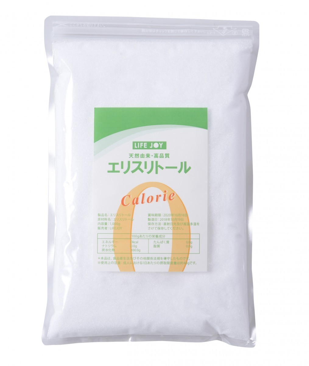 エリスリトールの特徴⇒甘味料に分類される、天然に存在する甘味料の一種です。 糖類ゼロ、天然由来の砂糖の代替品です。 ※100gあたりの栄養成分:エネルギー0kcal、たんぱく質、0.0g、ナトリウム0.0mg、炭水化物100.0g、脂質0.0g ●ご注意 一度に40gを超えて使用すると、お腹が緩くなる可能性が御座います。