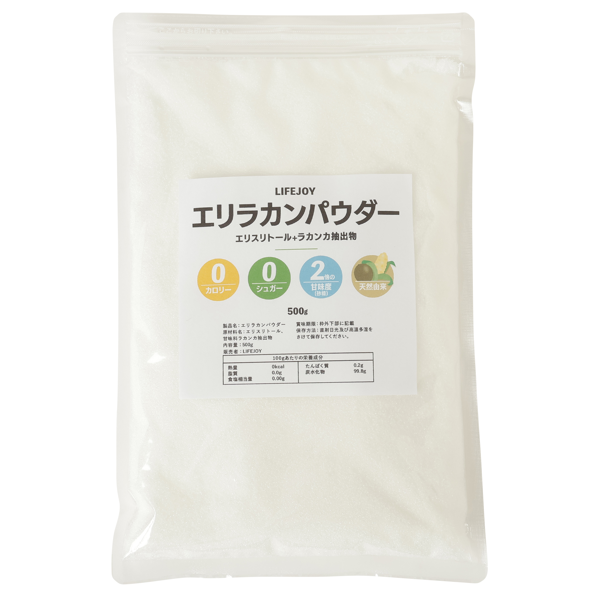 エリラカンパウダー 5個以上お買い上げで1個だけを無料でプレゼント致します!是非ご利用願います!エリスリトールより甘く、さわやかで上品な ”甘み” が完成致しました。「エリラカンパウダー」 は、 ?天然素材のエリスリトールにラカンカ抽出物を配合しています。 ?砂糖の約2倍の甘さですが、カロリーはほぼゼロです。 ?水に溶けやすい粉末のため取り扱いが容易で、熱やpHに対する安定性が高いので、幅広い食品に使用することができます。【”全国”送料無料&ポスト投函】 弊社発送完了後 本州、四国 →翌日納品、沖縄、九州、北海道→翌々日納品可能!(※大型連休前後や台風等が発生した際は遅れる可能性が御座います。時間帯はご指定頂けません&ポスト投函となりますのでご注意願います。)★ 【”全国”送料無料!】0カロリーで砂糖の”2倍以上の甘さ”(理論値)扱い易い国内メーカーのチャック付袋入り100gあたりの栄養成分:エネルギー0kcal、たんぱく質、0.2g、ナトリウム0.0mg、炭水化物99.8g、脂質0.0g※ご注意 1日摂取量は40gとなります。エリスリトールは厚生労働省が認めた0kcalの唯一の糖質です。 ●加工国:日本 ● 天然由来(エリスリトール( コンスターチ:中国) 、甘味料:ラカンカ抽出物) ● 国産メーカーのチャック式ポリ袋を採用しています、チャックの開け閉めも非常に簡単です。 ● ご注意 1日摂取量は40gとなります。
