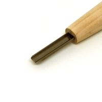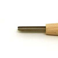 ・刃先は緩く湾曲した底面から垂直に立ち上がった側面を持つ独特の形状で、転写した図案の線ギリギリを彫り進めるためのものです。これにより、印面の縁を『丸刀より垂直に近い角度』で彫ることができ、さらに余白部分を『丸刀より深く』彫ることが可能となっています。