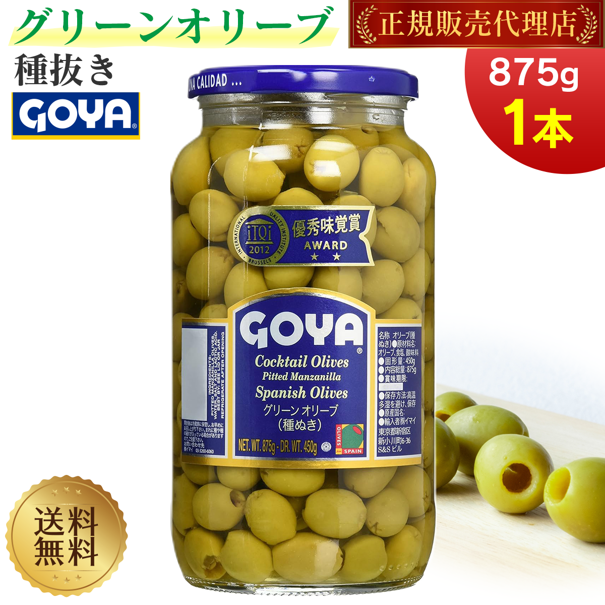 ゴヤ グリーンオリーブ 種なし 大瓶 875g ガラスビン入り スペイン産 グリーン オリーブ GOYA 正規品 送料無料