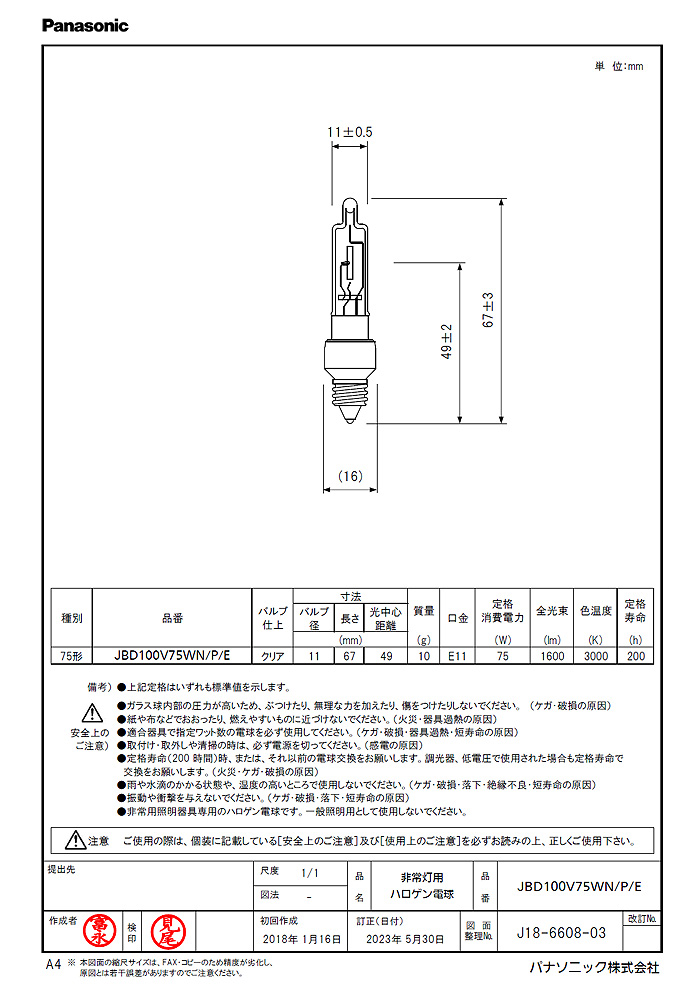 生産終了 数量限定品 / JBD100V75WN/P/E JBD100V75WNPE パナソニック 非常灯用 ハロゲン電球 75W E11口金 クリア球 「送料無料」