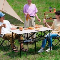 ・ロールトップでコンパクトに収納できるウッドグレインテーブルです。