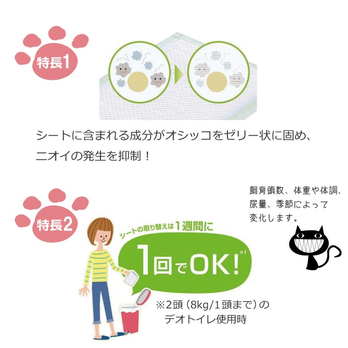 必ず「デオトイレ」または「その他の引き出し式システムトイレ」と一緒にお使いください。また、「デオトイレ」をご使用の場合は必ず「デオトイレ専用消臭サンド」も併せてご使用ください。1枚で2匹分の約1週間分のオシッコをしっかり吸収出来る「消臭・抗菌シート」です。