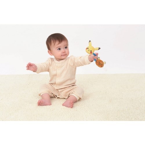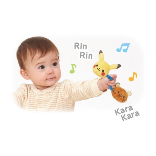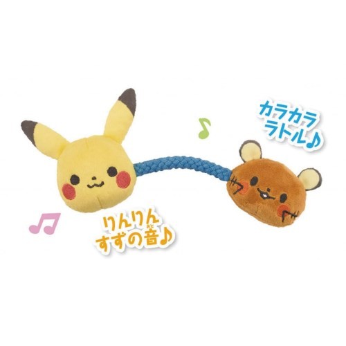ピカチュウに入っているリンリン鈴、デデンネに入っているがらがらラトルの2つの音を、ひもをにぎったり、振ったりすることによって、鳴らして遊びます。ひもでつながっているので、赤ちゃんもにぎにぎしやすい形状になっています。やわらかな素材で出来ているので、赤ちゃんのはじめてのおもちゃにぴったり。