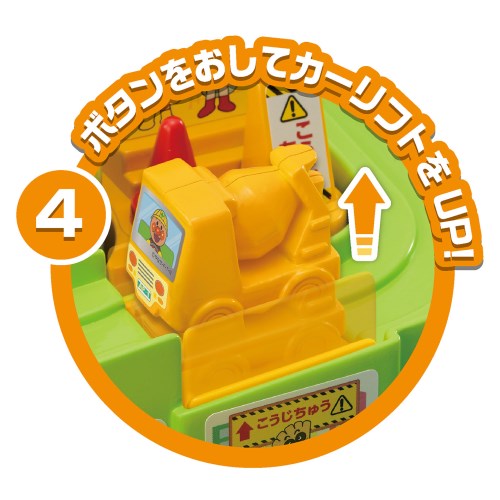 ■説明:赤いノブを回すとエレベーターが動きます。工事カーをのせて上にあげよう。 スロープを降りてきたら、工事カーの向きを変えよう。紫のレバーを奥に倒すとターンテーブルの向きが変わります。 工事カーがバイキンUFOクレーンに乗り込んだら、青いノブを....