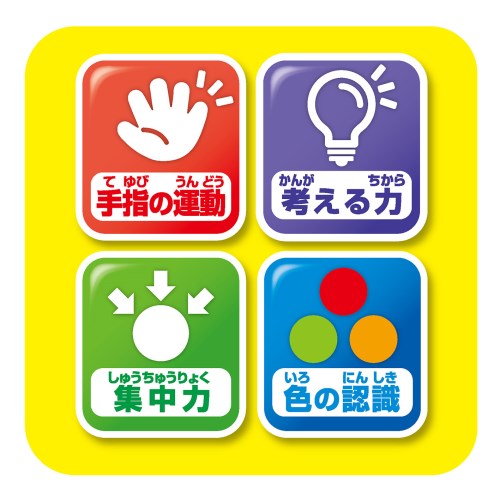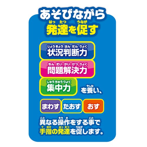 遊びながら状況判断力、問題解決力、集中力を養い、まわす、たおす、押すといった異なる操作をすることで手指の発達を促します。