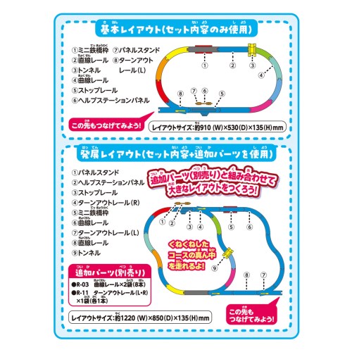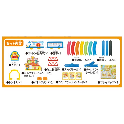 ゴットン(動力車)×1、客車×1、ミニ鉄橋枠×2、トンネル×1、ストップレール×1、ターンアウトレール(L)×1、直線レール×3、曲線レール×7、パネルスタンド×2、人形×1、ヘルプステーションパネル×1、プレイマップ×1、プレイカード×3、